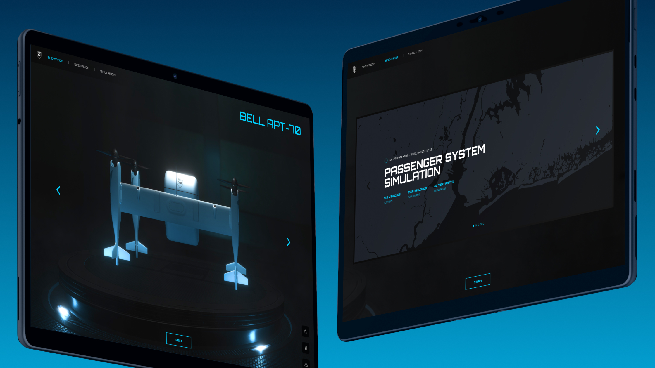 For this reason, Bell Flight came to Unity looking to design a 3D virtual product showcase. The mission: make something one could easily use to pitch and demonstrate the capabilities of these awesome machines. Not only did they need a virtual showroom of sorts for each vehicle, but they had piles and piles of data demonstrating what fleets of these things would be capable of. Naturally, it was my job to bring that dream to reality.